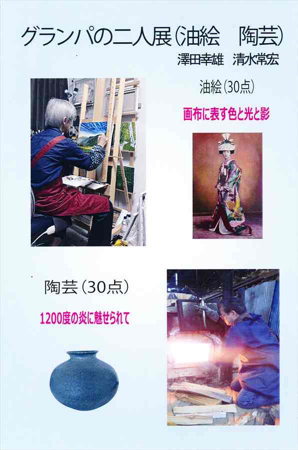二人のおやじが心を込めて仕上げた、陶芸と油絵の作品各30点を展示します。